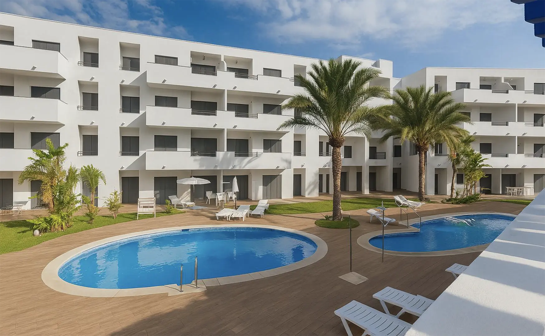 Los apartamentos tienen espacios luminosos y acogedores. Equipados con todas las comodidades que necesitas, son perfectos para relajarte después de un día de sol y mar. Sus zonas comunes están concebidas como un auténtico Resort. Sumérgete en la serenidad de nuestras piscinas exteriores y disfruta de unas instalaciones únicas en la zona, pues tienes a tu disposición Gimnasio, Business Center y Restaurante. Además, el ocio está garantizado con una Mini sala de proyecciones y un espacio dedicado a los más jóvenes: el Kids Club – Gaming Center.
