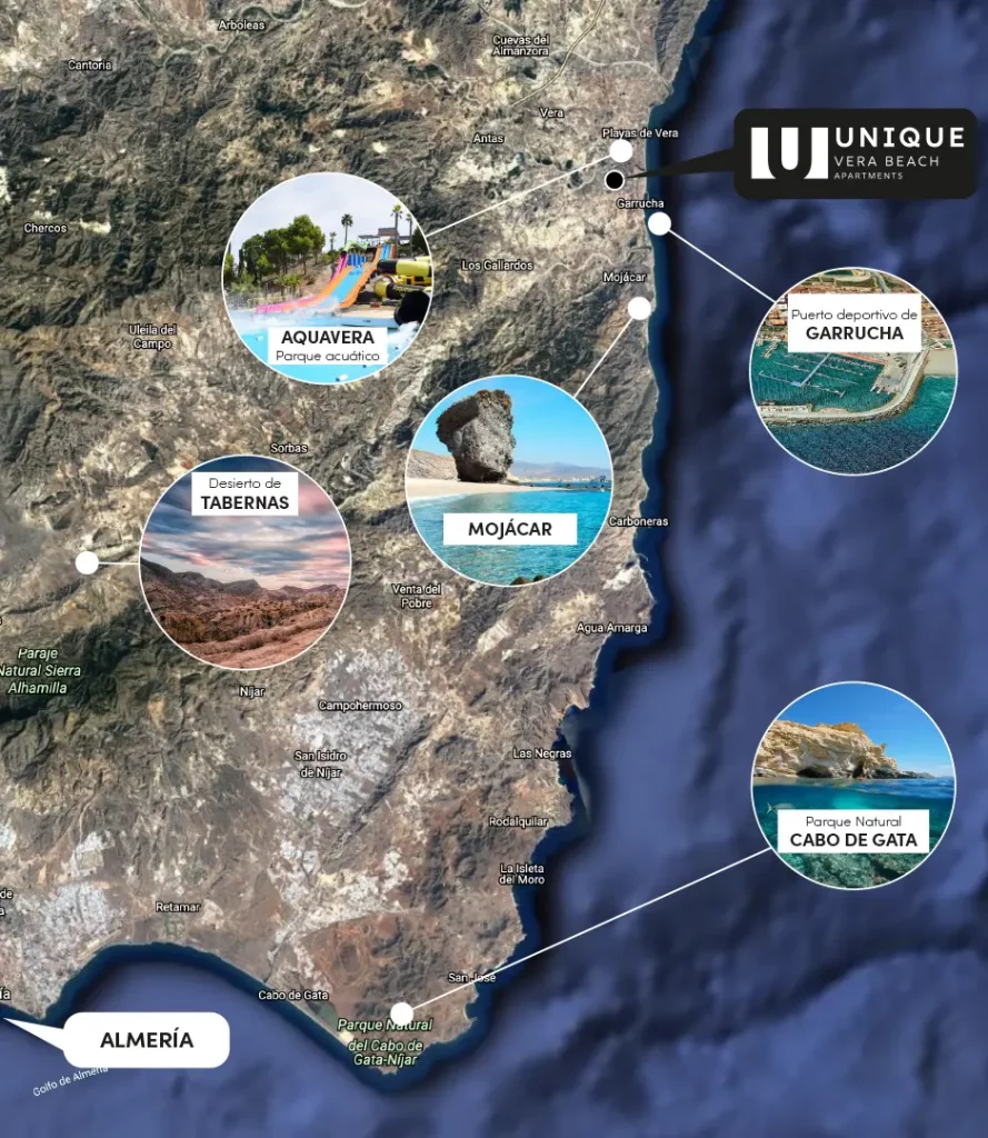 La zona ofrece la posibilidad de visitar el emblemático pueblo de Mojácar, a 8 kilómetros de Vera, y degustar la gastronomía del Puerto Deportivo de Garrucha o explorar la naturaleza salvaje del Parque Natural de Cabo de Gata y el Desierto de Tabernas. Muy cerca se sitúa Cuevas de Almanzora, que es un pueblo con casas-cueva tradicionales y la Geoda de Pulpí (atracción geológica) dentro del término municipal de Pulpí. Además, es un paraíso para los amantes del deporte, rodeado de 3 campos de golf de prestigio: el Desert Springs Resort, Valle del Este Resort y Marina Golf Mojácar, todos ellos de 18 hoyos. Y próximamente un cuarto campo de golf en Macenas (Mojácar).